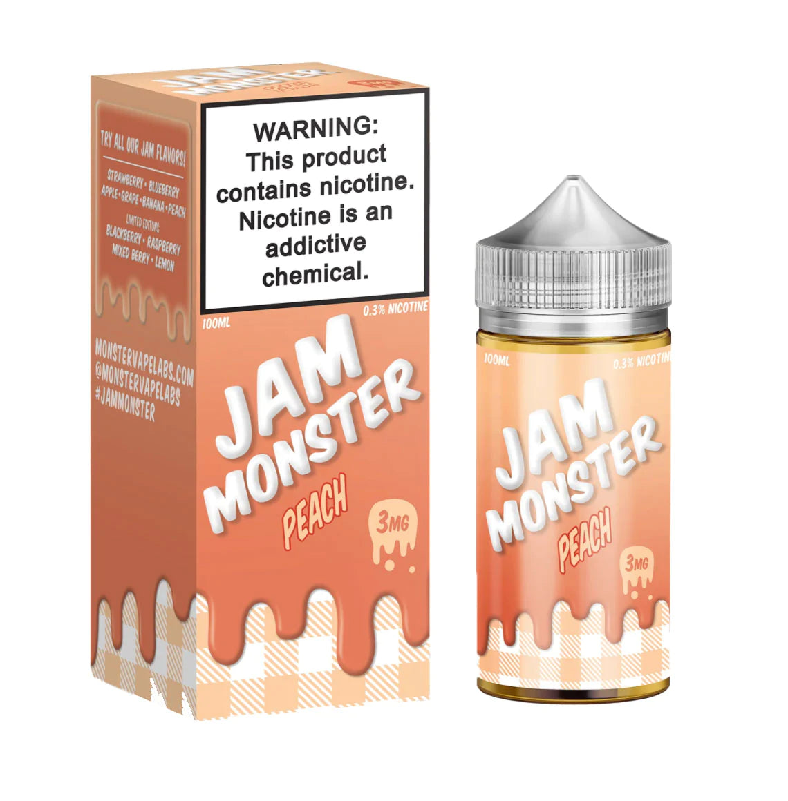 The Peach Jam Monster is sold is a massive 100ml bottle a delicious blend of sweet peach jam spread over buttered toast for a vape juice that entices the senses.